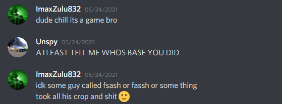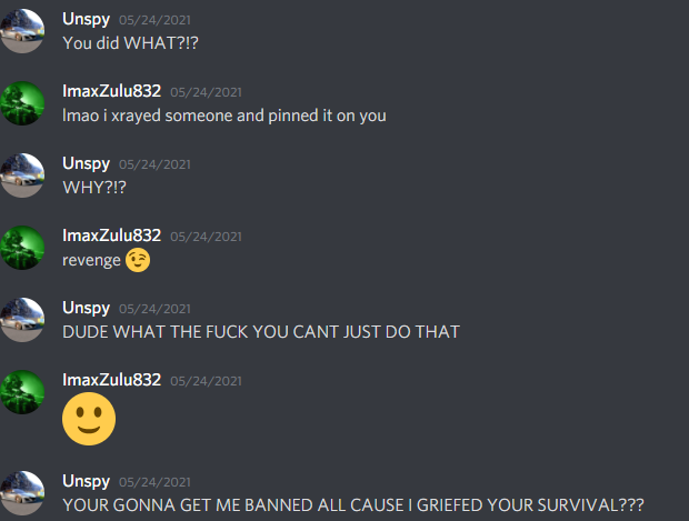 What is your explanation for your actions? Why should you be unbanned? Really, my classmate known as XDAce or imaxZulu832 was being an asshole lately, and he went too far to frame me for xraying into fsashes base. dude was mad cause i got rid of his mc world ;) anyways he basically wrote signage after digging into his base saying his discord user but my ingame name to frame me.